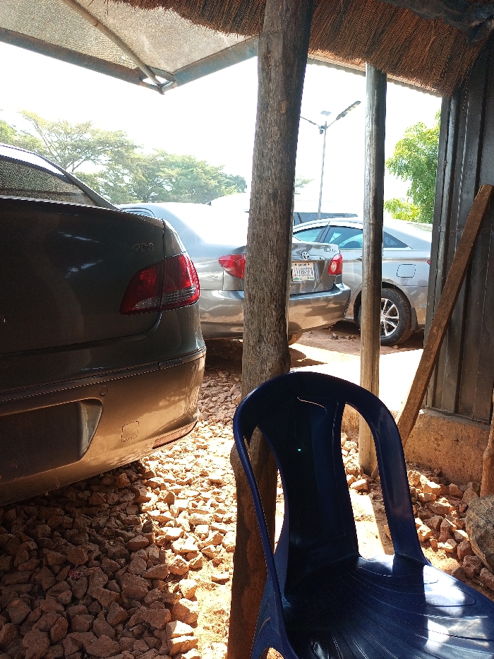 The image captures an outdoor scene in Kakuri Gwari, Nigeria, observed from under a partial canopy. In the immediate foreground, a dark blue plastic chair is positioned on the right, partially obscured by a thick, rough-hewn wooden pole acting as a structural support. To the left, the rear section of a dark-colored sedan, possibly a Peugeot 406 based on visible badging, is prominent, exhibiting a red taillight assembly and rear parking sensors on the bumper. The ground beneath the canopy and extending into the midground is composed of irregular, reddish-brown gravel or small stones. In the midground, directly behind the dark sedan, a silver Toyota sedan is parked, displaying a Nigerian license plate: "LAGOS A Y765FA". Another silver sedan is partially visible to the right of the Toyota. A tall street light pole, featuring a solar panel and luminaire, stands between the parked vehicles and the distant horizon. The overhead canopy structure is a light-colored material, likely fabric or sheet metal, supported by wooden beams, with a section of thatched or woven material visible on its underside on the right. The background consists of a bright, hazy sky above a line of green trees. No individuals are present in the scene.