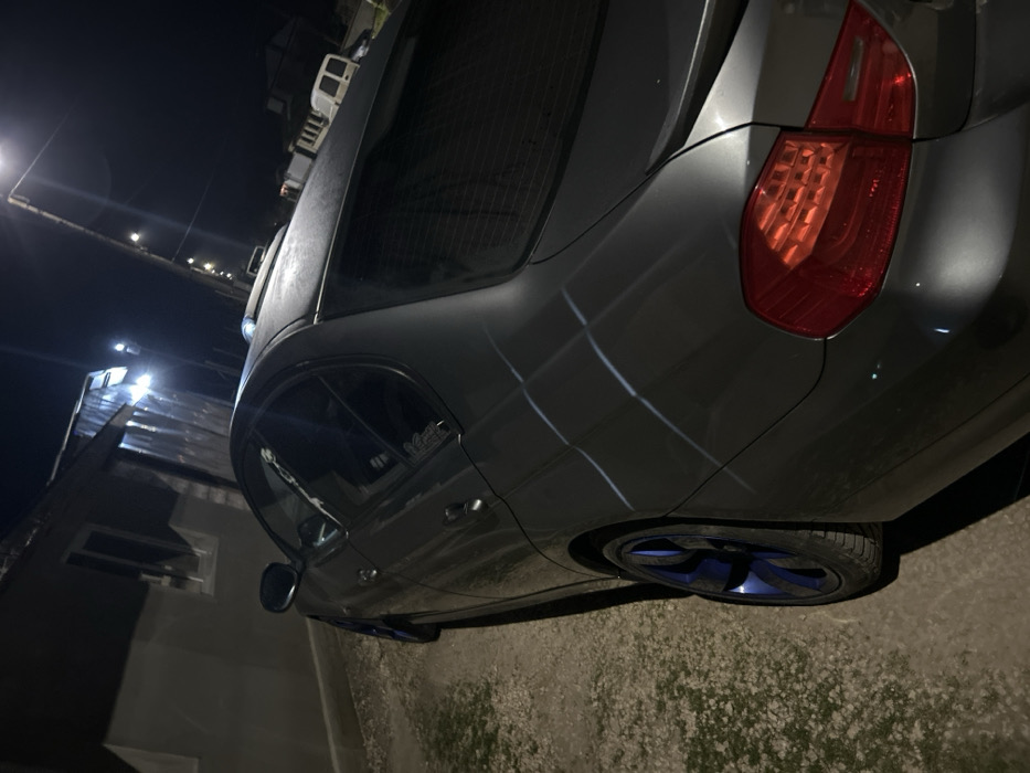 The image depicts a dark grey four-door sedan, consistent with a BMW 3 Series (E90 generation), parked outdoors at night in Tsarichino, Bulgaria