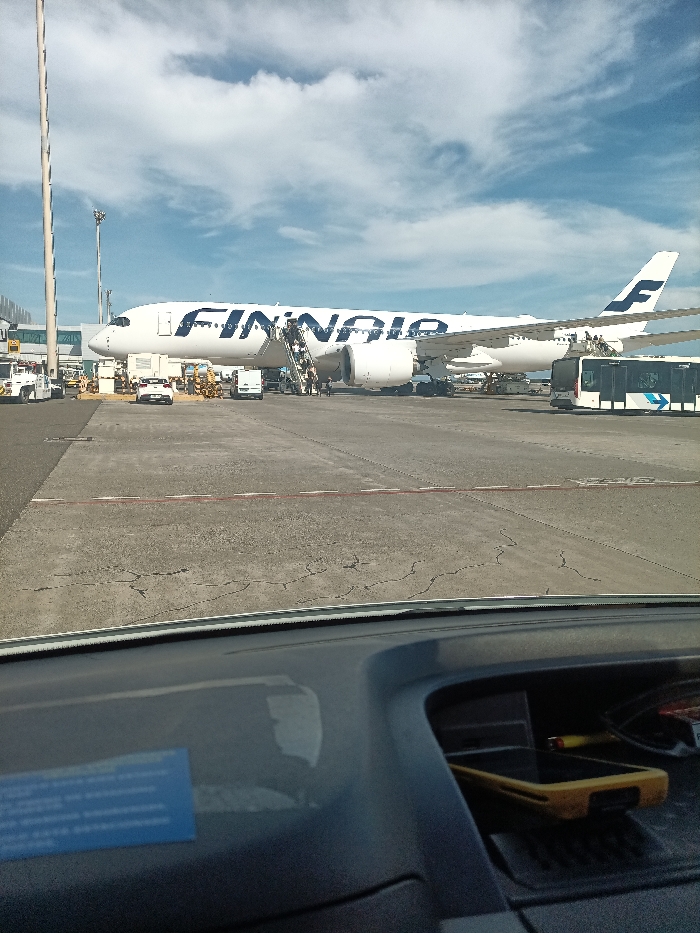The image displays an airport tarmac scene at Gran Canaria Airport in Ingenio, Spain, captured from inside a vehicle. The vehicle's dashboard occupies the foreground, featuring a blue rectangular card on the left and a yellow-cased smartphone in a central compartment on the right. The central subject is a white Finnair Airbus A350-900 aircraft, identified by the prominent "FINNAIR" livery on its fuselage and the blue 'F' logo on its tail fin. The aircraft's registration, OH-LWL, is visible on the rear fuselage. Two mobile passenger stairs are positioned at the aircraft's doors, with multiple individuals visible on both sets of stairs, indicating ongoing boarding or disembarking activity. Surrounding the aircraft on the concrete tarmac, which is marked with a red and white dashed line, are various airport ground support vehicles and equipment. These include a white service truck near the aircraft's nose, a white passenger car further back, and an assortment of yellow ground equipment. To the right of the aircraft's tail, a white airport bus with blue and green markings is parked, with passengers visible near its exit, suggesting disembarkation or connection. In the background, sections of an airport terminal building with jet bridges are visible, along with tall metal light poles. The sky above is partly cloudy with visible patches of blue.