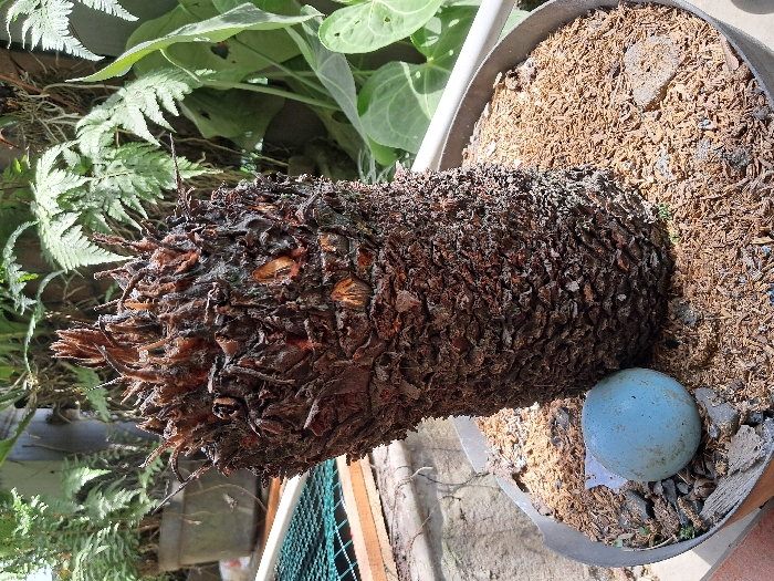 A large, dark brown, textured plant caudex, approximately cylindrical with a spiky, withered apex, is centrally positioned within a black plastic pot