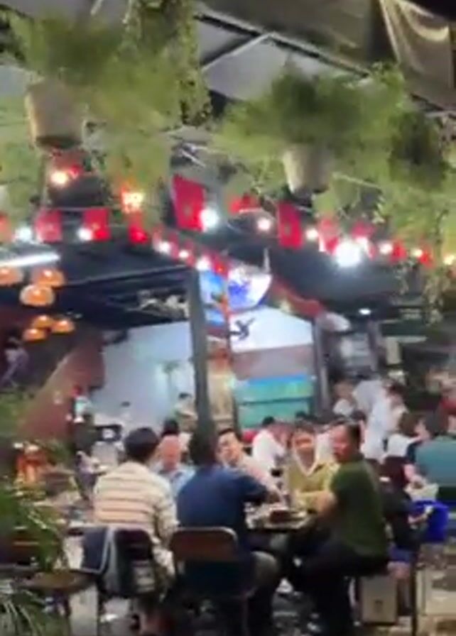 The video depicts an outdoor seating area of a restaurant or bar at night. The area is decorated with hanging plants, string lights, and small red flags. Several groups of people are seated at tables, engaging in conversation and eating. The area is covered by a partial roof, and there are buildings visible in the background. The floor is paved with interlocking stones.