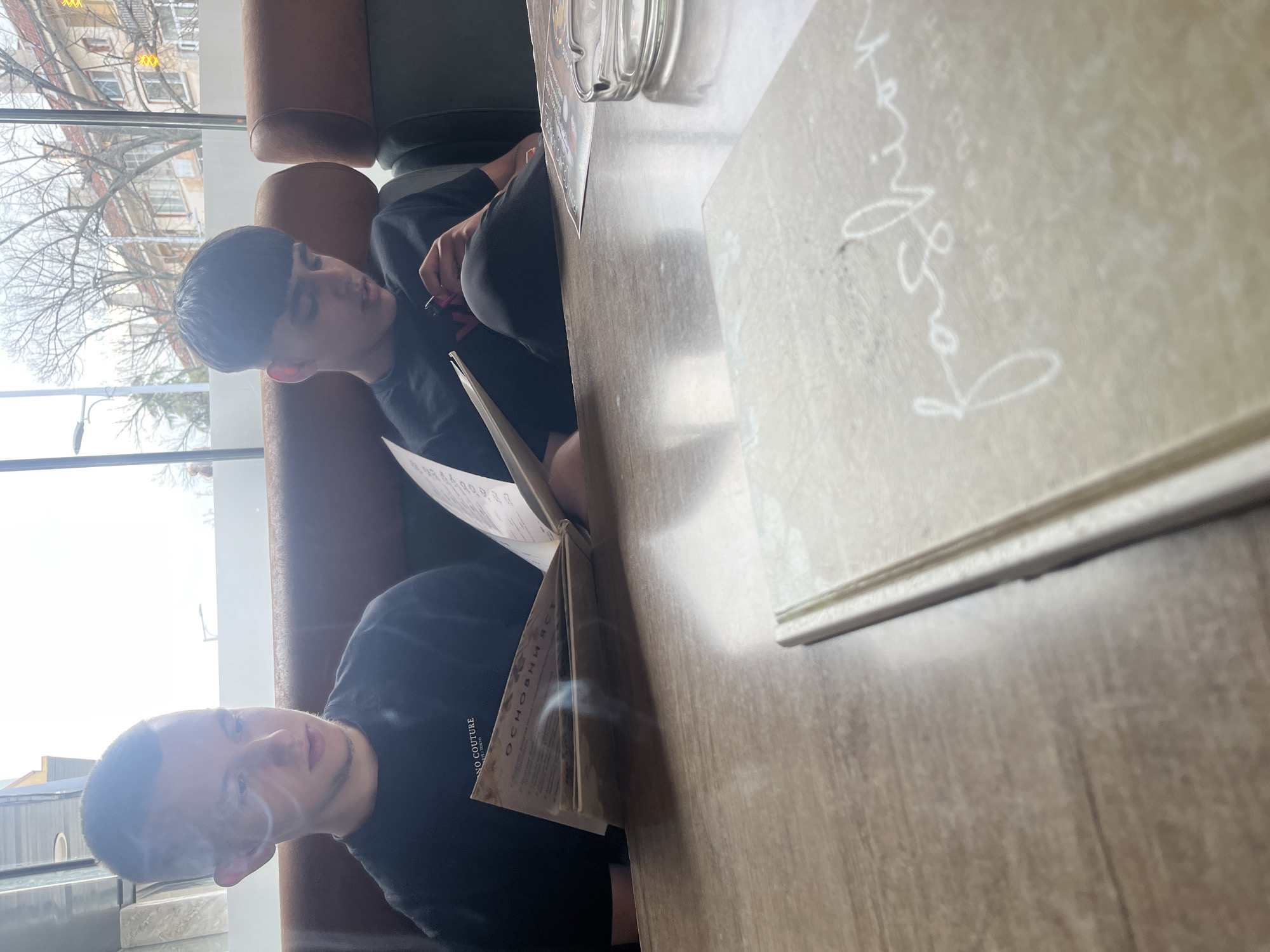 The scene is set indoors at a café or restaurant in Nova Zagora, Bulgaria, with large windows overlooking an urban street. Two young males are seated in a booth at a light-colored wooden table. The male on the left, with a short haircut and wearing a black "NO COUTURE" shirt, is looking down at an open menu displaying Cyrillic text. A distinct plume of smoke rises near his face. The male on the right, with dark hair and wearing a black t-shirt, holds a small, pink object, possibly a vape pen, in his right hand while looking downwards. On the table, an open menu is positioned in front of the left male, while another menu with "Fashion B&R" inscribed on its cover lies partially visible in the foreground. A clear glass ashtray is also present on the table near the right male. Beyond the window, bare-branched trees and multi-story buildings with tiled roofs are visible, suggesting a daytime setting. A streetlight is also discernible outside. The booth seating consists of brown and dark grey upholstered sections.