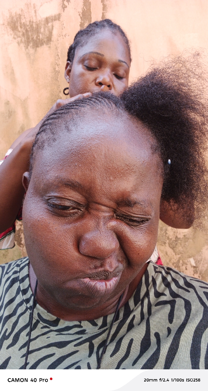 The image displays two individuals, purportedly in Ado, Nigeria, engaged in hair braiding against a light brown, textured wall. In the foreground, a person with dark skin exhibits a strained facial expression: eyes tightly shut, eyebrows furrowed, and lips pursed. Their hair is tightly braided in cornrows on top of the head, with natural, dark curls visible on the side. They wear a light-colored t-shirt with a dark, irregular stripe pattern and a thin dark cord around their neck. Positioned behind them, a second individual with dark skin, eyes closed, actively uses their hands to braid the foreground person's hair. The skin of both individuals shows a visible sheen, consistent with perspiration or oil.