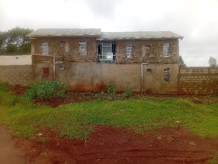 A two-story, grey building with a corrugated metal roof sits behind a low brick wall. The lower section is plastered, while the upper floor features exposed blocks with windows. A small red door is visible on the left. Vegetation fills the space between the building and the foreground. The ground is a mix of red soil and green grass. The sky is overcast.