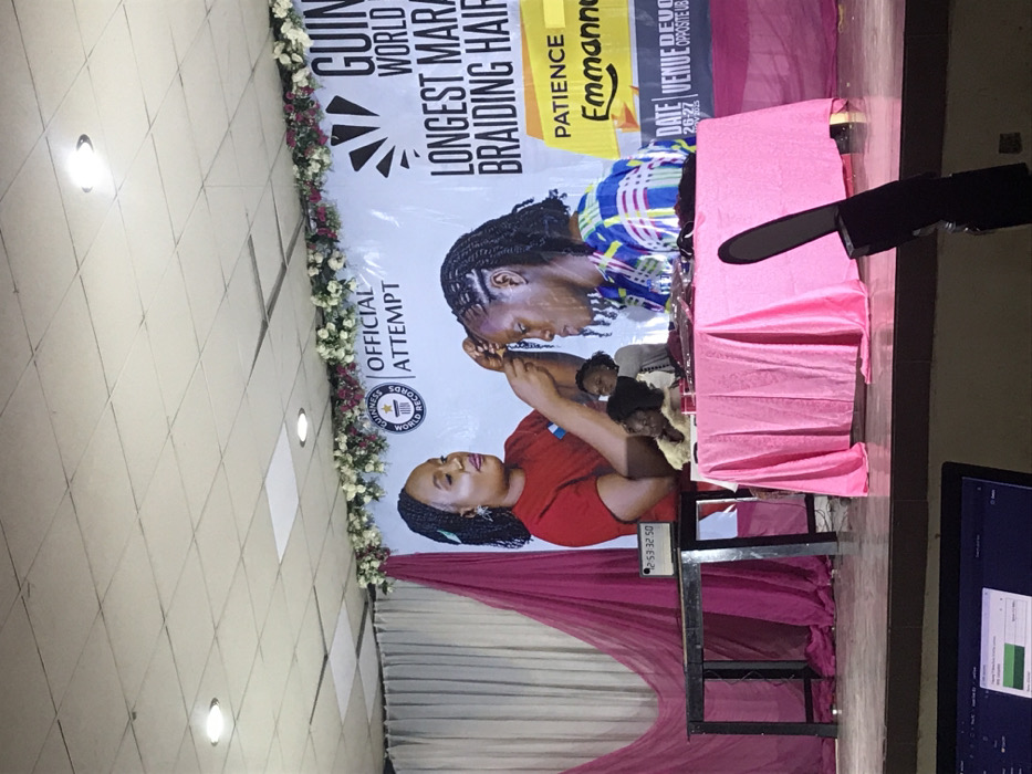 Guinness World Record attempt for the longest marathon braiding hair. A banner features two women, one braiding the other's hair. "Official Attempt" and the Guinness World Records logo are displayed. Below the banner, a table covered with a pink cloth stands on a stage, with a computer monitor visible to the side. A small digital timer on the banner indicates a time of "2:53:32.50". The text on the banner includes "Patience Emmanne", "Date", and "Venue", with "Devon" and "Opposite UB" mentioned, likely indicating the location.