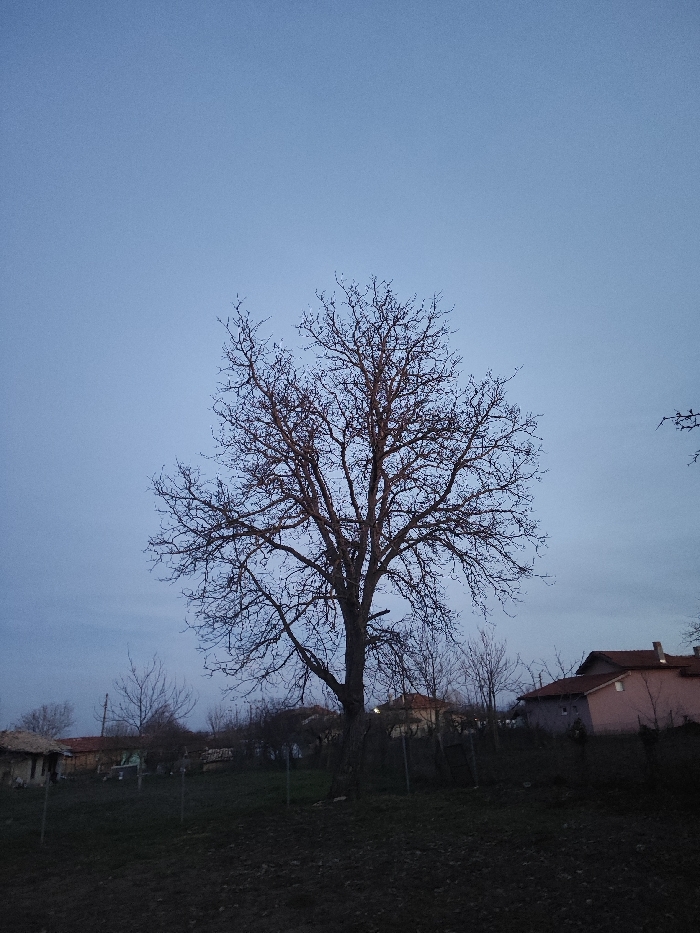 The image presents an outdoor scene in Chudomir, Bulgaria, under twilight conditions. A large, bare deciduous tree, devoid of leaves, stands centrally, silhouetted against a pale blue sky that occupies the upper half of the frame. Its extensive network of branches is clearly visible. The foreground consists of dark, uneven ground, indicative of a field or unmaintained yard, with several thin, vertical posts suggesting a fence line. In the midground and background, multiple residential buildings with red-tiled roofs are situated. On the left, structures are partially obscured by sparse, bare trees, with one house appearing to have a straw or thatched roof. On the right, houses with traditional terracotta roofs are visible, one featuring light-colored exterior walls. No individuals, animals, specific actions, or interactions are discernible.