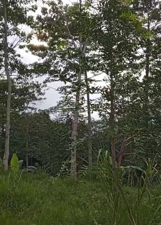 The camera is stationary, offering a ground-level view of a lush green field or meadow. Tall grass dominates the foreground, interspersed with various green plants and vegetation. Behind the grass are a collection of trees of varying heights. Some trees appear to be taller and more mature with denser foliage, while others are younger and more slender. The sky is overcast, with the sun partially obscured by clouds. The overall environment gives the impression of a rural or natural setting.
