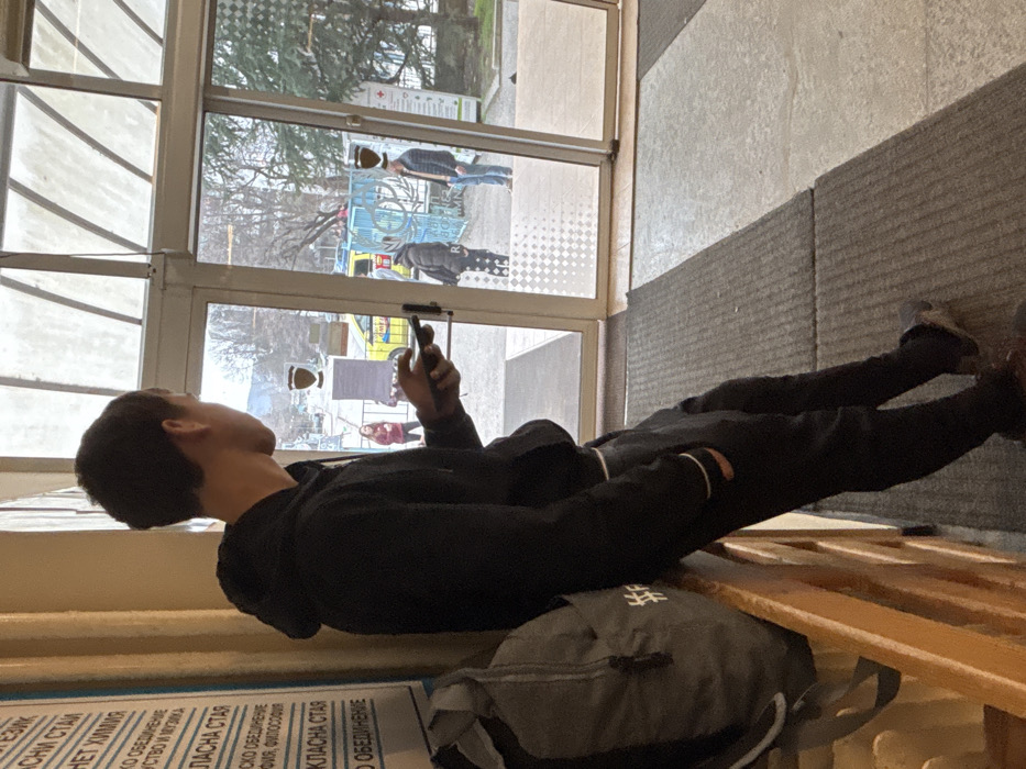The image depicts an indoor scene looking out through a multi-pane glass entrance at the National High School of Humanities and Arts "Konstantin Preslavsky" (Национална художествена гимназия "Константин Преславски") in Varna, Bulgaria, specifically at ul. "Konstantin Preslavski" 63. In the foreground, a young male, appearing in his late teens or early twenties, stands leaning against a light brown wooden bench or railing on the left side of the frame. He wears a black hooded sweatshirt and dark sweatpants with white trim around the pockets. He holds a dark-colored smartphone horizontally with both hands, his thumbs positioned as if actively using the device. A grey backpack with a white hashtag symbol is placed on the wooden structure to his left. Adjacent to the male, on the left, a vertical white sign with blue Bulgarian text is visible. Readable phrases include "УЧЕБЕН ЕЗИК" (Study Language), "НЕТ ХИМИЯ" (No Chemistry), "ОБЕДИНЕНИЕ" (Association/Union), "ФИЛОСОФИЯ" (Philosophy), and "КЛАСНА СТАЯ" (Classroom), confirming the high school setting. The floor in the immediate indoor area is covered by two rectangular grey carpeted mats. Beyond the glass doors, an outdoor urban environment is visible. A light blue metallic gate with decorative patterns, consistent with the school's entrance, is prominent in the mid-ground. Through and around this gate, multiple elements are seen: * A white vehicle with yellow and orange stripes, resembling an ambulance, is partially visible. * A yellow vehicle, potentially a taxi, is also partially visible behind the gate. * To the right of the gate, a white sign with a red cross indicates a medical or first aid point. * Several pedestrians are present outside: a woman in a red top stands near a sign to the left, and two other individuals are near the blue gate—one wearing a dark jacket and backpack, the other a light brown jacket. * Trees with bare branches and some evergreen foliage are scattered in the background, suggesting a colder season. * Two distinct brown shield-shaped logos, matching the emblem of the National High School of Humanities and Arts "Konstantin Preslavsky," are affixed to the glass panes.
