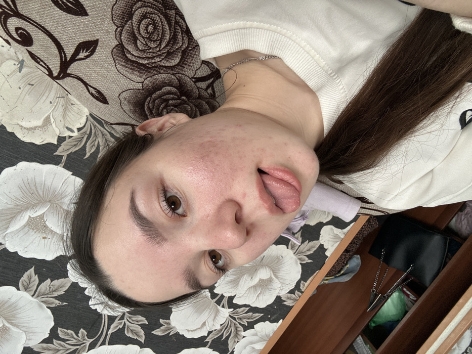 This image depicts an indoor scene featuring a young adult female subject. She possesses dark brown hair, light brown eyes, and fair skin exhibiting visible blemishes and redness. Her tongue is extended from her mouth, and she is wearing a light-colored, long-sleeved crew-neck top along with a thin silver-toned chain necklace. The background consists of a dark-toned fabric patterned with large white and grey floral designs. In the lower-left corner, an open wooden furniture compartment is partially visible, containing a black handbag with a metallic chain strap and other indistinct items. The specific location within the city of Olkhovka, Russia, cannot be determined from the visual information provided.
