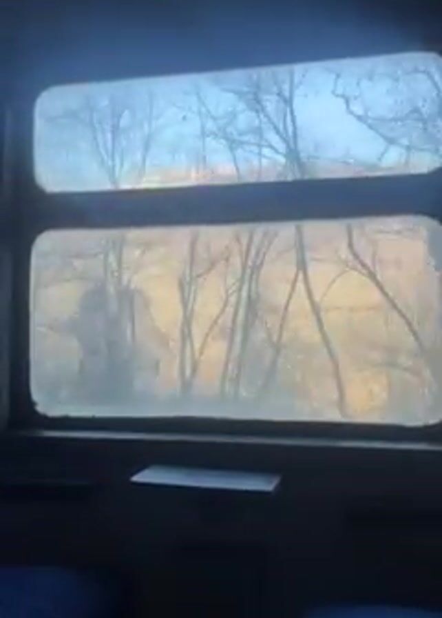 A passenger sits inside a train, looking out the window. Through the window, a forested area is visible. The trees lack leaves, and the ground appears covered in a brownish grass or foliage. The sky is partly obscured by the trees. The window is divided into two rectangular sections, with a small ledge underneath. The interior of the train appears dark and utilitarian. The seat is dark blue, possibly made of a textured material. The train is moving.