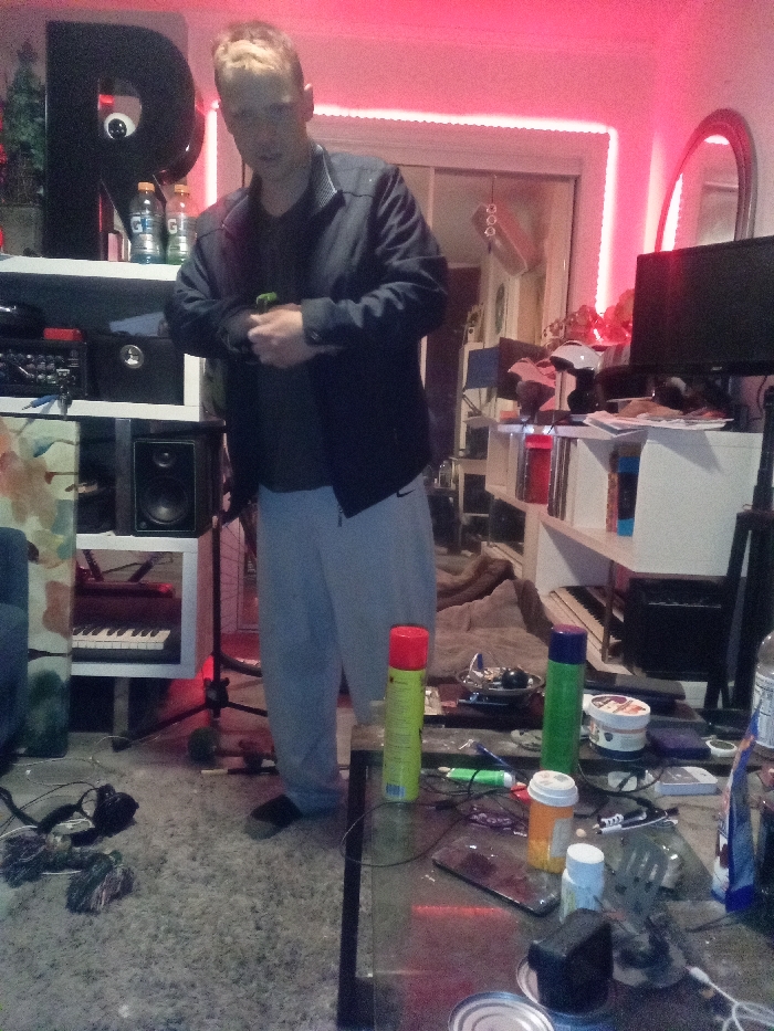 An indoor scene, likely a residential or studio space, is primarily illuminated by red LED strip lighting along the top perimeter of the walls. A single Caucasian male, with light-colored hair, stands centrally in the frame, facing slightly left and looking downwards. He wears a dark zip-up jacket over a dark t-shirt, light grey sweatpants with a visible Nike logo on the left leg, and dark slippers. He is holding a small, green, cylindrical object with both hands. The environment is cluttered. To the male's left, a white shelving unit displays several items: a large black letter "P" with a circular, eye-like design, two Gatorade bottles, a small potted plant, an audio mixer, and two dark speakers. Below, a small electronic keyboard with white keys is visible. To the male's right, a reflective table in the foreground contains numerous items including a yellow aerosol can with a red cap, a green aerosol can with a purple cap, an orange pill bottle, a smaller white container, a dark smartphone or tablet, a metal spatula, a small bowl with miscellaneous dark objects, various wires, a plastic bag, and two metal cans. Behind the table, a black computer monitor on a stand and another white shelving unit with books and other items are visible. A silver-framed oval mirror hangs on the far right wall. A skateboard is suspended near a doorway or large opening in the background, which reveals further interior space. The floor is covered with a light-colored carpet, showing scattered wires and dark fabric items. A dark, multi-legged equipment stand is positioned near the male's right leg. The specific location within Los Angeles is not discernible from the provided image.