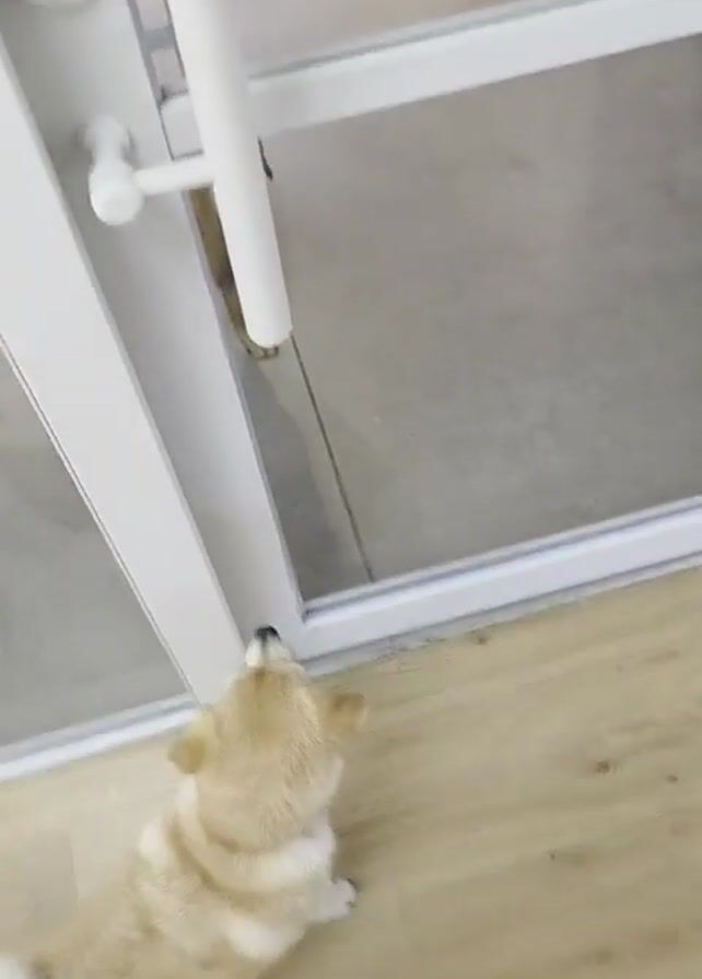 A small, light-colored dog stands in front of a glass door with a white frame and handle. The dog looks up at the door. The door is then opened, and another dog, slightly larger and tan in color, walks into the room. The two dogs then briefly sniff each other. The floor is made of wooden planks on one side of the door and grey tiles on the other. A potted plant is also visible in the background.