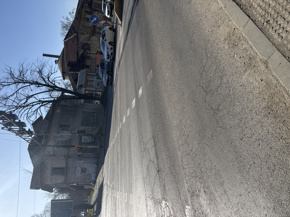 The image depicts an urban street intersection in Sofia, Bulgaria, located at the corner of Ulitsa "Kozloduy" and Bulevard "Knyaginya Maria Luiza," with the building at Knyaginya Maria Luiza 63 prominently featured. The scene is observed under clear skies with direct sunlight, casting distinct shadows. The foreground consists of an asphalt road surface exhibiting extensive cracking and wear. White dashed lines are painted on the asphalt, indicating either a pedestrian crossing or a vehicle turning lane. A concrete curb and grey tactile paving tiles define the road's edge to the right. At the intersection, an overhead traffic signal structure is visible, along with a pole-mounted traffic light displaying a red illumination. Several vehicles are present on the right side of the roadway: a light blue/grey hatchback is positioned in the midground, followed by a white hatchback, and a white SUV further along the street. A blue circular road sign with a white arrow pointing downward and to the right is affixed to a pole on a small road island. A white kiosk with "TMX" branding is also visible on the right. The left side of the intersection features a two-story corner building with a red-tiled roof, characterized by visible plaster deterioration, exposed brick, and multiple windows. A shopfront on its ground level displays "БАЗАР" in Cyrillic. Behind and to the right of this building, a larger, older structure with a distinctive circular, tiled roof and a prominent chimney stack is visible, identifiable as a section of the Sofia Central Market Hall. Bare deciduous trees are interspersed within the background foliage. No human figures are present in the frame.