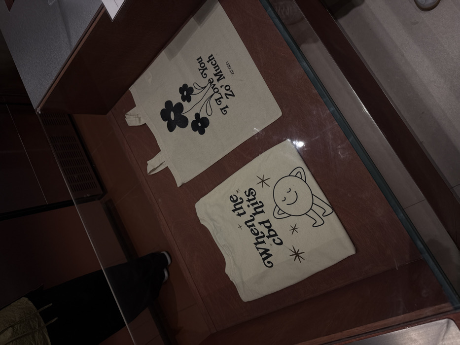 The image depicts an indoor commercial display located in San Pedro Garza García, Mexico. The foreground features a display case with a clear glass top and a dark reddish-brown wooden frame. Inside the case, two light-colored textile items are laid flat. On the left is a folded t-shirt with black lettering that reads "When the cbd hits," accompanied by a graphic of a smiling, relaxed character lying down with arms behind its head, surrounded by small starbursts. On the right, a flat canvas tote bag with two handles displays black graphics of three stylized flowers and the text "I Love You Zo' Much," with "zo'zen" in smaller print below. In the background, behind the display case, the lower half of an individual is visible, wearing dark trousers and light-colored athletic shoes. The background wall or counter surface matches the dark reddish-brown tone of the display case, and a horizontal ventilation grate is present at floor level. Reflections are evident on the glass surface.