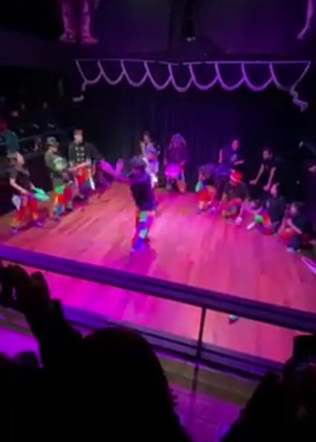 group of approximately 15 people performing on a stage. The stage is lit with pink and purple lights and has a wooden floor. The backdrop is a dark curtain with a scalloped white trim. Most of the performers are wearing black tops and brightly colored checkered pants. Some are playing drums, while others are manipulating batons. An audience is partially visible in the foreground, watching the performance.