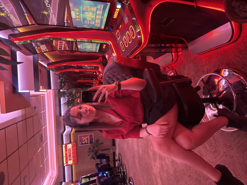 A single female subject is seated on a black, chrome-base adjustable bar stool in what appears to be Reddy Casino in Plovdiv, Bulgaria