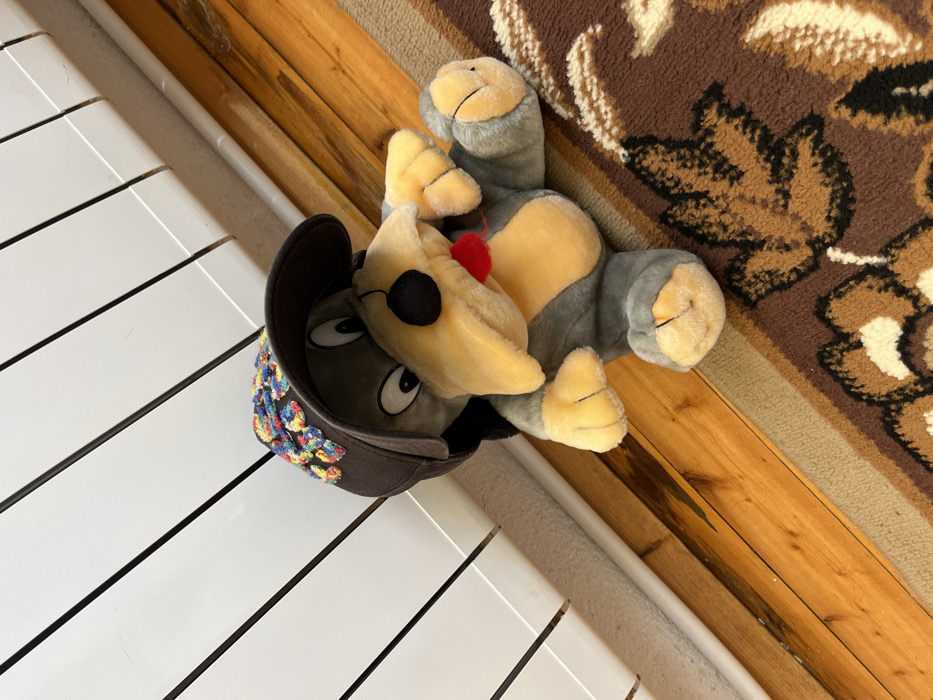 - "The scene, situated in a room within the city of Sheynovo, Bulgaria, presents a grey and light yellow plush dog toy" by FM-yO5cv1, licensed under CC BY 4.0