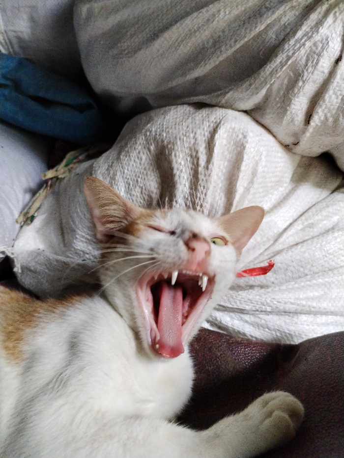 A white and orange cat with a very wide open mouth, displaying its tongue and teeth. The cat's one eye is open and the other is closed as if it's yawning or hissing. It lies atop a brown surface. Behind the cat are off-white sacks and a glimpse of a blue cloth. The image has a slightly soft focus.
