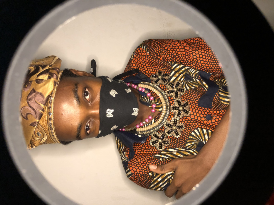 - "A person wearing traditional clothing, including a patterned headdress, face mask, and colorful, patterned shirt with ornate necklaces, is centered in a circular frame" by FM-IRJUp1, licensed under CC BY 4.0