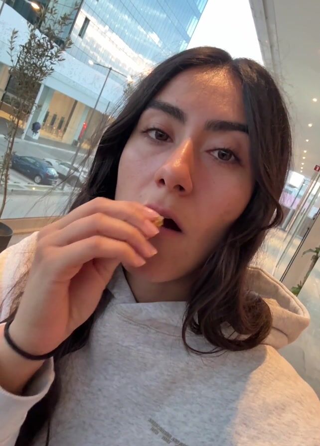 A woman is shown in a close-up shot indoors with natural light coming in from the outside. She has long, dark hair and is wearing a gray hooded sweatshirt. She is holding a small, triangular piece of food in her hand and eats it. The woman looks at the camera, smiles, and then puts the food in her mouth. Outside, there is a modern building with glass windows, a street, a parked car, and some plants.