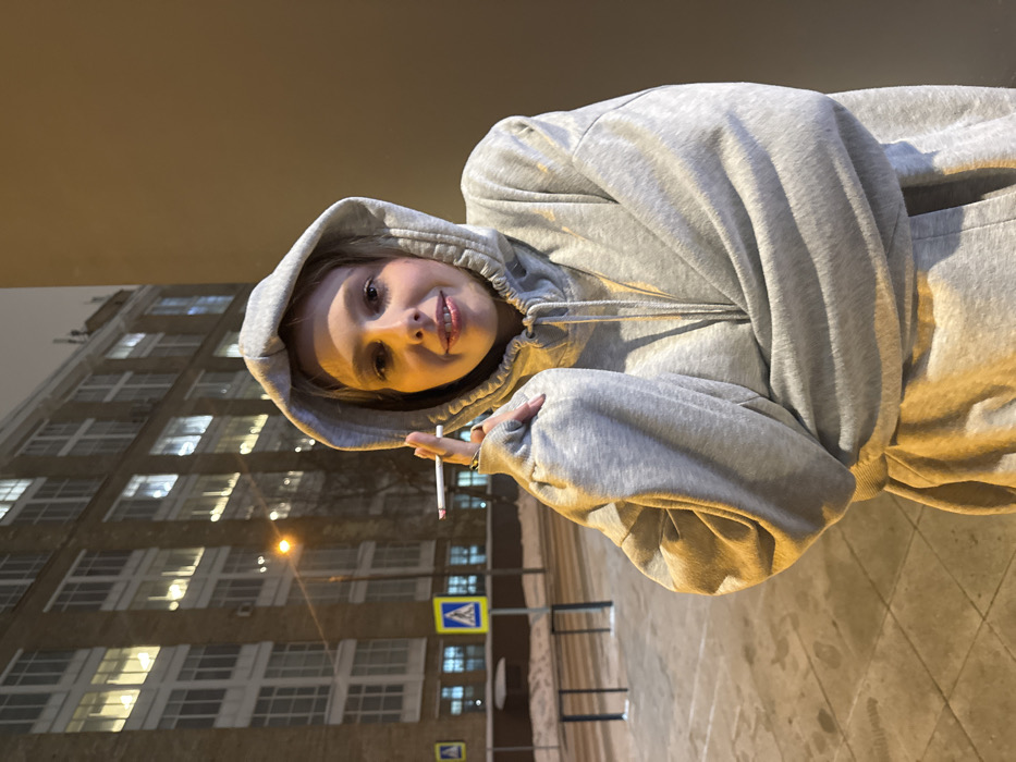 A blonde woman in a grey hoodie holds a cigarette. The hood frames her face. In the background, a large building with multiple windows is visible. There's also a street with crosswalk signs. The scene appears to be at night. The picture is taken at an angle.
