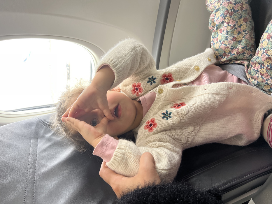 The image depicts a young child seated in an airplane window seat at an airport within the city of Paray-Vieille-Poste, France. The child, with light brown, curly hair, is centrally positioned, facing forward, and making a triangular hand gesture over their eyes, looking through it with a slightly open mouth. They are dressed in a light pink long-sleeved shirt, an off-white knitted cardigan with red, pink, and teal floral embroidery and yellow buttons, and floral-patterned pants. An adult's left hand, covered by a dark, textured sleeve, is visible in the lower-left, gently holding the child's left wrist. The immediate environment shows a dark grey leather-like airplane seat behind the child and a light grey armrest to their right. A rectangular airplane window occupies the right side of the frame, revealing a bright exterior, possibly a tarmac or sky, with a faint blue object, likely part of another aircraft, visible in the upper right quadrant of the window view. The scene is brightly lit, primarily by ambient light from the window.