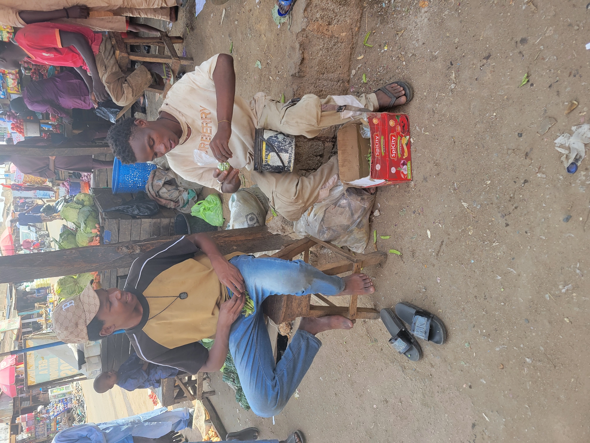 This image captures an outdoor market scene in Madalla, Nigeria. Two young adult males are seated on low wooden stools on a dirt ground in the foreground. The male on the left wears a tan and black shirt, blue jeans, and a tan baseball cap with a "B" logo; his feet are bare, and black "BK" slides rest on the ground beside him. He holds green pods in his lap and looks towards the male on the right. The male on the right wears a light tan t-shirt with "BURBERRY" text, tan cargo pants, and dark flip-flops; a black bucket is attached to his belt, and a strap is visible on his right leg. He is actively shelling green pods into a clear plastic bag, with additional pods visible in a red "SpicCity" cardboard box at his feet. Scattered green pods are visible on the ground around them. In the background, numerous market stalls display produce such as cabbage and melons, along with various packaged goods. Several other individuals, including a small child seated on a stool, are present, indicating a busy commercial area. Red and white market umbrellas are visible overhead further in the background, along with distant motorcycles. The ground is composed of uneven dirt with minimal debris.