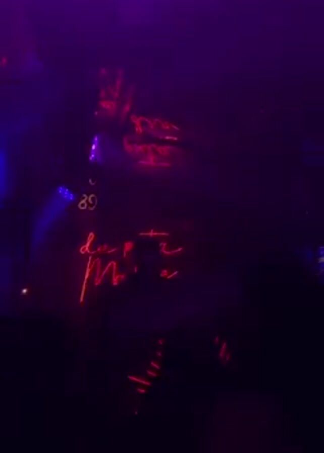 dark club environment with red neon signs reading "de peste Marie" and other indistinct writing