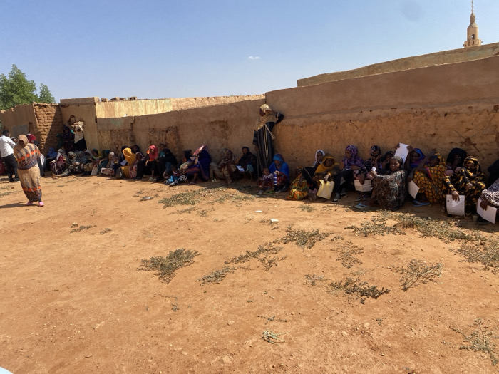 An outdoor scene in Omdurman, Sudan, depicts approximately 30-40 women and some children gathered on reddish-brown dirt ground under a clear blue sky