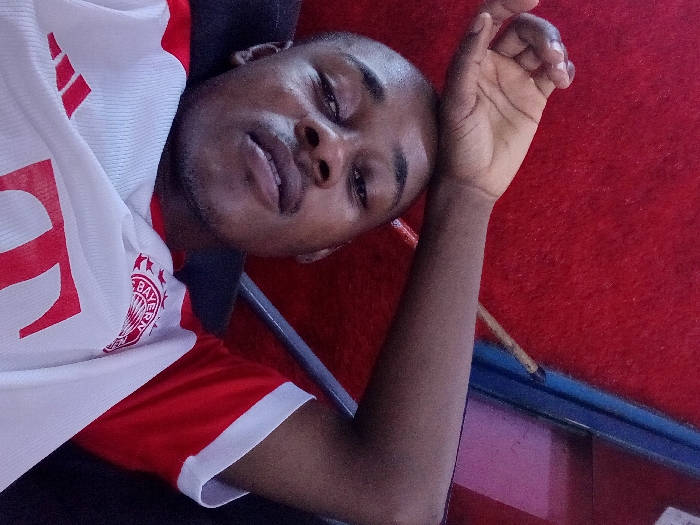 An adult male with dark complexion, short dark hair, and light stubble on his chin and upper lip is depicted in a close-up, upward-angled shot. He is wearing a white and red Bayern Munich football club jersey, identifiable by the club crest on the left chest and a partial "T" logo in red on the front. His left arm is bent, with his hand resting near his forehead, while his gaze is directed towards the camera. The subject appears to be lying on his back, supported by a dark headrest or cushion. The background consists primarily of a textured red surface, resembling carpet or upholstered material. A blue-colored linear object, possibly a frame or rail, is visible in the upper right quadrant of the image, alongside a blurred object with a magenta hue. The specific location within the city of Dorayi, Nigeria, is not visually discernible from the image content.