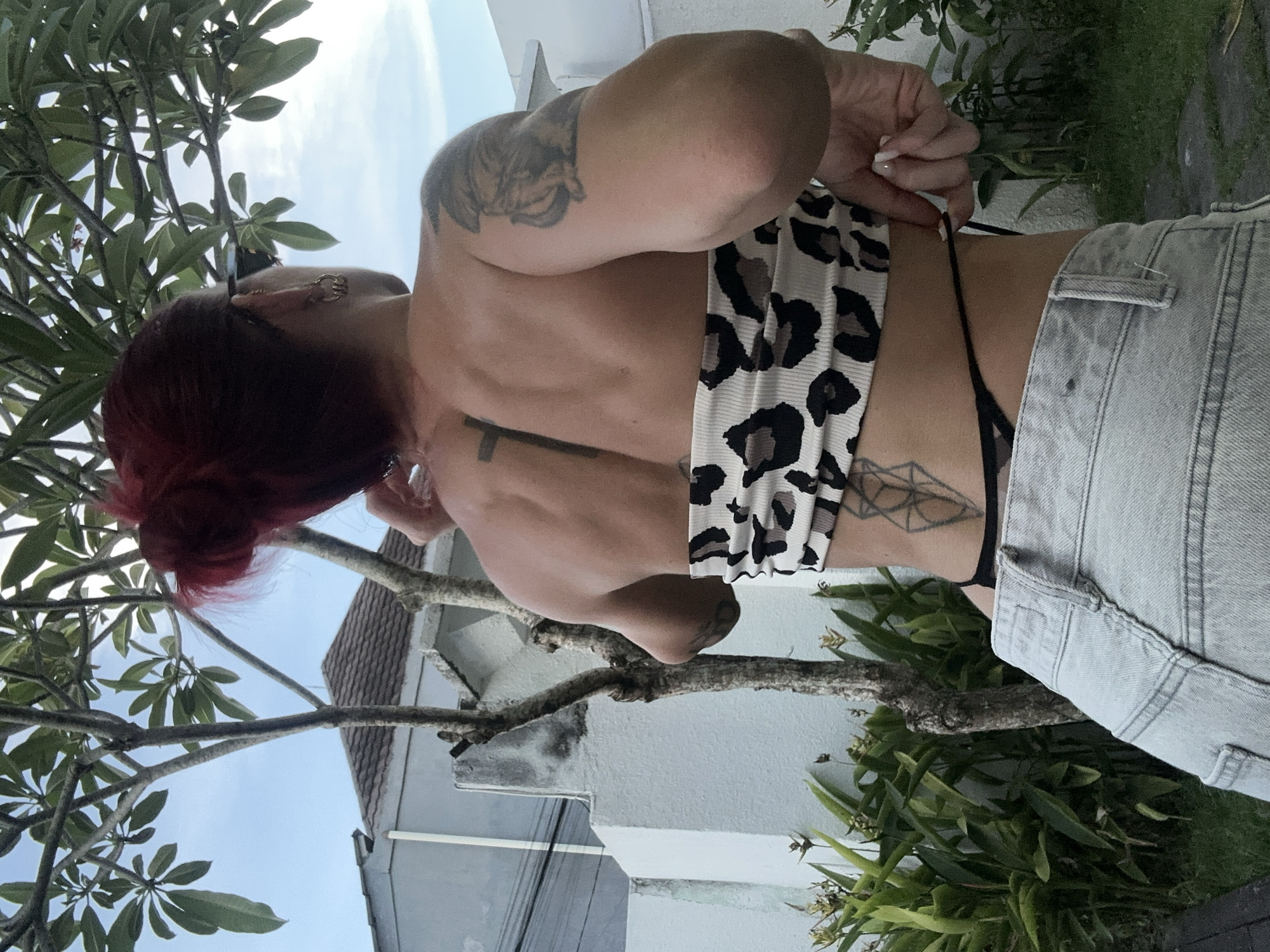 A person with red hair, an exposed back, and multiple tattoos is standing outside in a tropical setting. The person is wearing a leopard-print top, jeans, and a black thong. The person is standing next to some foliage, tree branches, and the corner of a building. The location appears to be Dalung, Indonesia. The person is adjusting the thong strap with their hand.