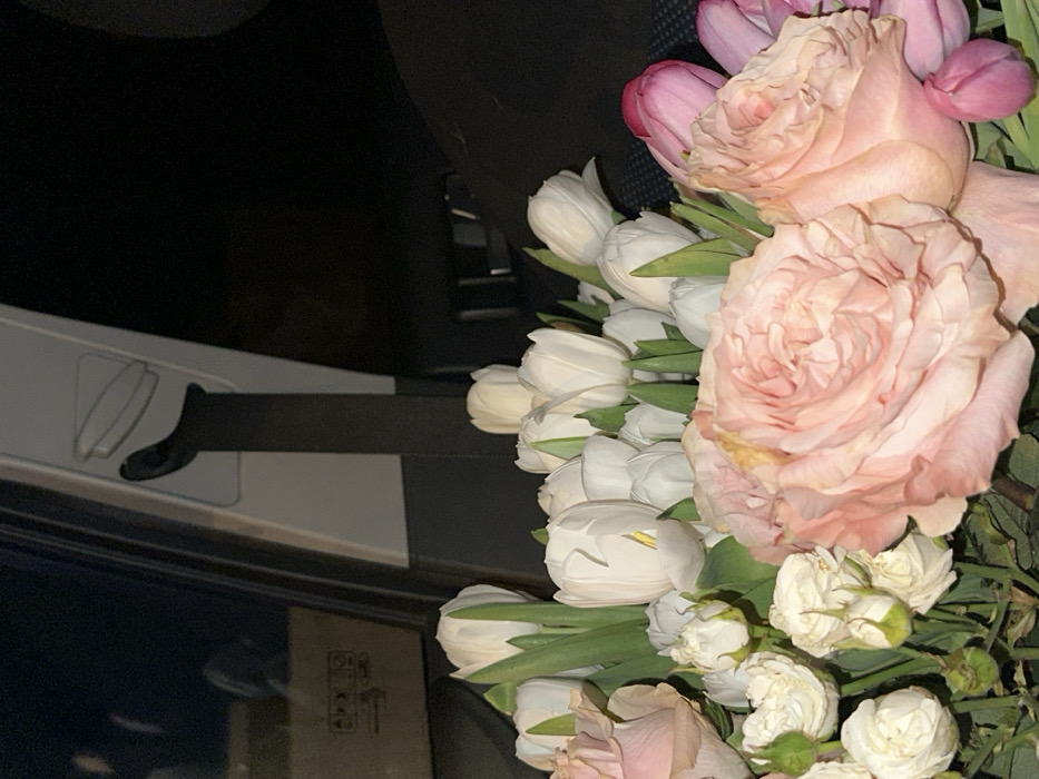 The image displays a large floral bouquet positioned within the passenger compartment of a vehicle at night, reportedly in the city of Базарово, Russia. The bouquet primarily features light pink garden roses, numerous white tulips with prominent green stems, smaller white cluster roses or buds, and a few pink tulips. Some of the larger pink roses exhibit minor yellowing on their petal edges. The background reveals elements of the car's interior: a dark window reflecting a light-colored box with black symbols, and a black seatbelt extending vertically from a light grey interior panel. The scene is illuminated by an unseen light source, contrasting with the dark exterior visible through the window. No individuals or specific actions are depicted.