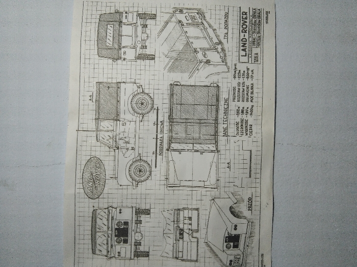 The image displays a photograph of a hand-drawn technical blueprint for a Land Rover Series vehicle, rendered in dark ink on light-colored graph paper