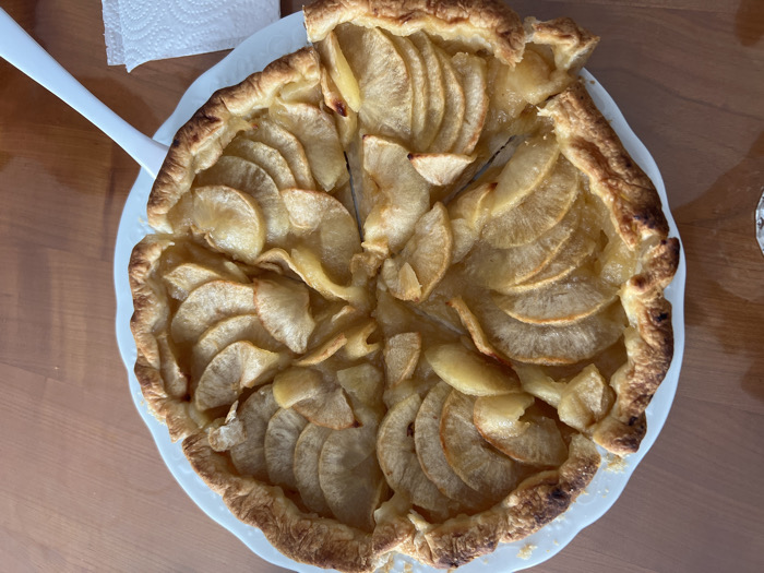 - "The image depicts a partially sliced rustic apple tart or galette centered on a white, irregularly edged plate" by FM-sLRpr2, licensed under CC BY 4.0