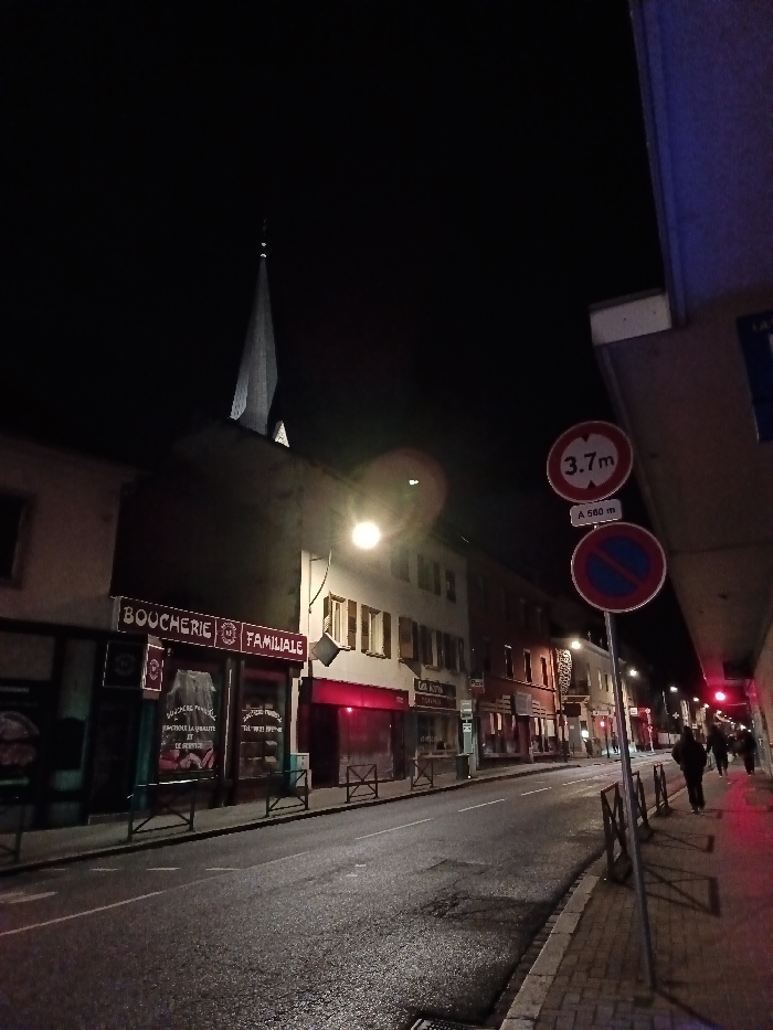 Night street scene in a European town featuring a butcher shop "Boucherie Familiale" and other businesses. A tall church spire is silhouetted against the dark sky. Streetlights illuminate the wet road, casting reflections. Traffic signs indicating a height restriction of 3.7 meters and no parking are visible. People walk along the sidewalk on the right.