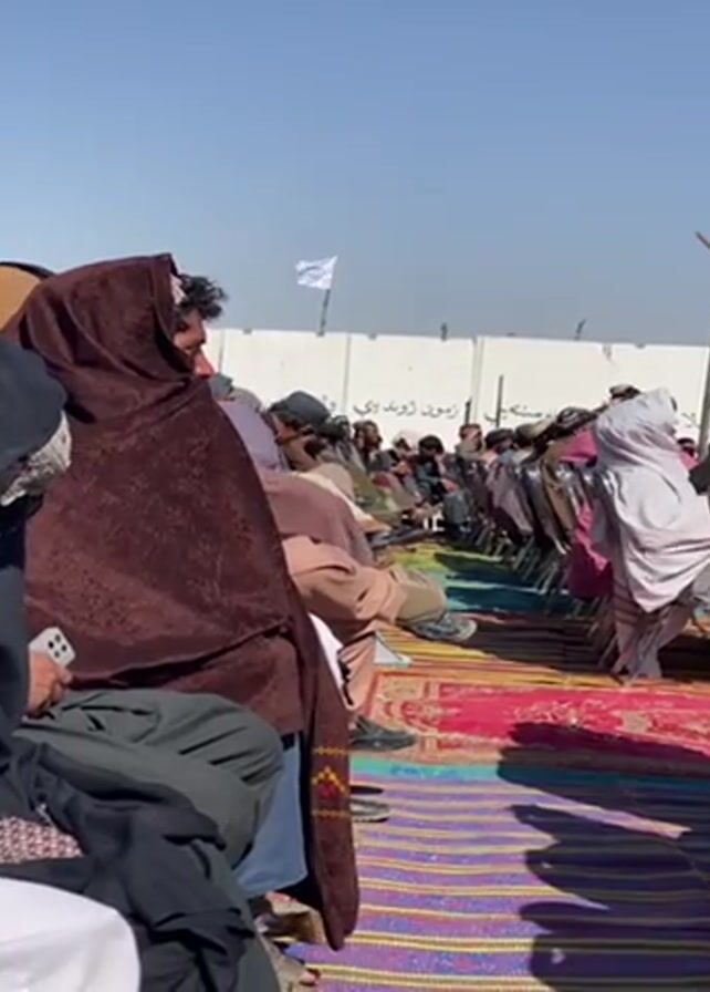 group of people sitting in chairs outdoors, possibly at an event or gathering. The attendees are dressed in a variety of traditional or casual clothing, with some wearing head coverings. The seating is arranged on a colorful patterned rug placed on the ground. In the background, there is a white wall with what appears to be writing on it, and a small flag is visible atop a pole. The sky is clear and blue, indicating a sunny day.