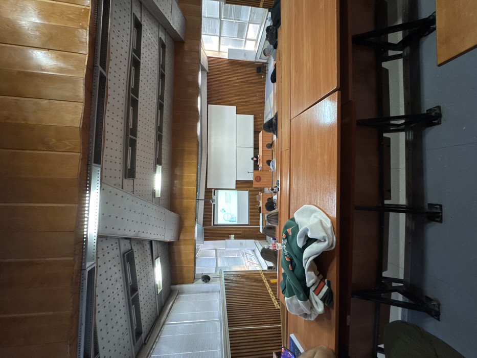 The image displays the interior of a tiered university lecture hall, likely located in Sofia, Bulgaria. The specific university or building cannot be definitively identified from the visual information. The room features ascending rows of individual desks and attached chairs, all constructed from light-toned wood. The floor is uniformly light grey. The walls are clad with vertical strips of medium-toned wood paneling. Large windows on both the left and right sides of the hall are fitted with white horizontal blinds, admitting natural light. The ceiling is composed of light grey perforated panels, interspersed with rectangular fluorescent light fixtures and dark ventilation grates. In the immediate foreground, on the desk closest to the observer, a green, white, and orange hooded sweatshirt is folded. Partially visible on the same desk are a blue textbook and the observer's forearm. Further down the aisle, a red plastic beverage bottle rests on a desk. Approximately 10-15 individuals, consistent with students, are seated in the mid-ground rows, facing the front of the hall. Most are viewed from behind or in profile, appearing engaged in the session. At the front of the room, one individual with dark hair is standing behind a wooden lectern, leading what appears to be a lecture or presentation. The front area of the lecture hall includes a large white projector screen displaying a presentation slide featuring light blue graphical elements and text, with a prominent icon resembling a hand washing station. To the right of the projector screen is a two-panel white whiteboard. A long, light-colored wooden table spans the front of the stage, positioned in front of the lectern. The environment indicates an active academic instruction setting.