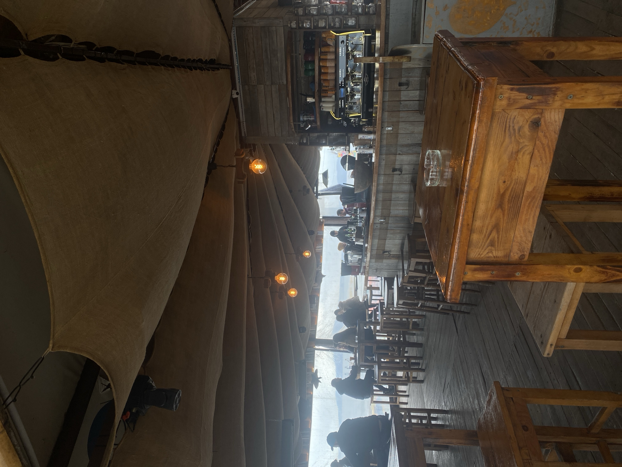 This indoor scene shows a restaurant or bar interior. The space is notable for its unique ceiling made of fabric panels arranged in a spiral, illuminated by suspended light bulbs. The floor and furniture, including tables and chairs, appear to be constructed from wood. People are seated at the tables, implying activity like dining or socializing. A bar area is visible in the background with shelves containing various items. The view through the window suggests an outdoor scene, possibly a landscape or cityscape. The scene is a restaurant or bar in Burgas, Bulgaria.