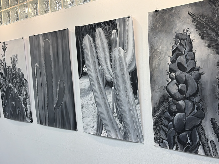 The image displays an indoor wall in Ramat Gan, Israel, featuring five monochrome artworks arranged horizontally. These artworks are grayscale paintings or prints depicting various cactus species. From left to right: the first, partially visible, shows a dense cactus cluster with a single blooming stalk; the second presents two tall, slender cactus stems; the third centrally depicts several ribbed cacti in a landscape setting; the fourth showcases a segmented, columnar cactus with defined spines, accompanied by a partial palm frond in the upper right; and the fifth, partially visible, continues the segmented cactus motif with additional smaller cacti. Each artwork is secured to the textured white wall by small black clips attached to its upper corners. Above the paintings, a row of translucent glass blocks is integrated into the wall structure. The scene is uniformly illuminated. No individuals or active interactions are present.
