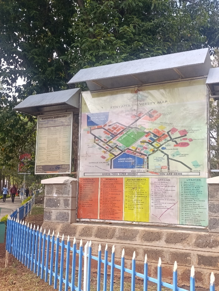 The image displays an outdoor scene at Kenyatta University, situated along the Nairobi-Thika Super Highway in Nairobi, Kenya