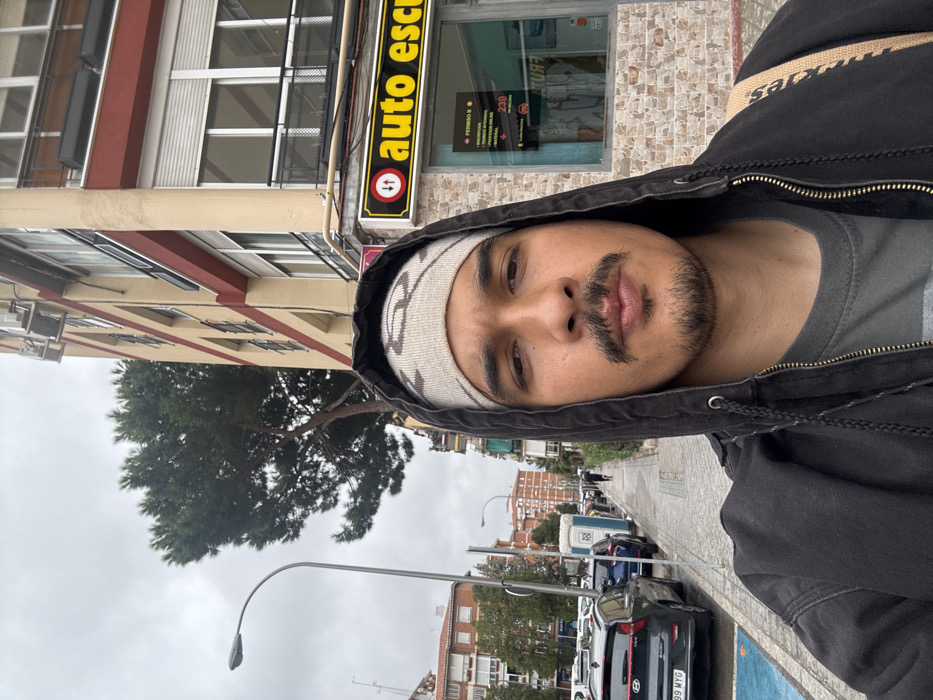 A male individual is depicted in a selfie, positioned centrally in the foreground, wearing a dark hooded jacket over a grey t-shirt and a light-colored beanie with a dark pattern