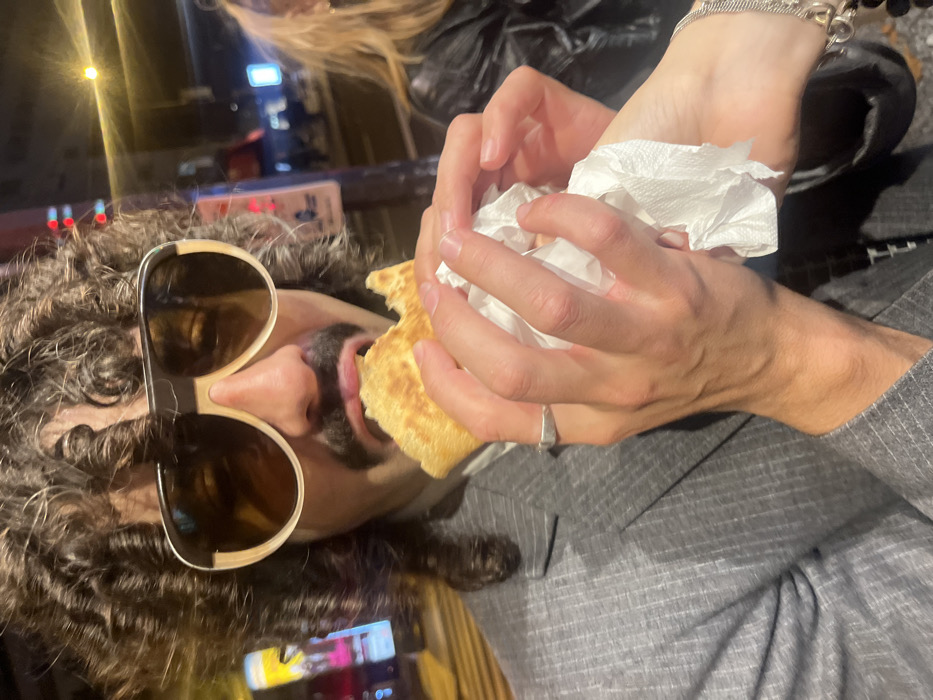 The image captures an urban nighttime scene in Paris, France. A person with voluminous curly brown hair, a mustache, and large, cream-colored aviator-style sunglasses is featured prominently, biting into a piece of flatbread or pizza. This individual is wearing a grey pinstripe suit jacket over a light-colored collared shirt, and a silver signet ring is visible on their right ring finger. To the right, partially visible, is another individual with blonde hair, wearing a black leather jacket and a multi-charm bracelet on their left wrist. Both individuals' hands are holding a crumpled white paper napkin. The background is out of focus, displaying blurred artificial lights and indistinct urban structures characteristic of a city street after dark.
