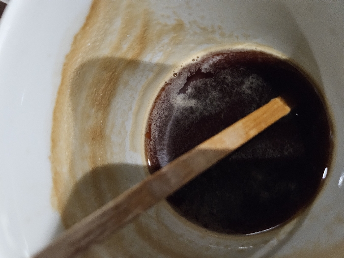The image displays the interior of a white ceramic mug, situated in the city of Varna, Bulgaria. A dark brown liquid, consistent with residual coffee, occupies the bottom of the mug. A light brown, flat wooden stirring stick is partially submerged within the liquid, angled from the upper-left toward the lower-right. The inner walls of the mug show irregular streaks and dried residue of a lighter brown color, indicative of previously contained liquid. Small white bubbles are present on the surface of the dark brown liquid. No individuals or external environmental features are depicted.