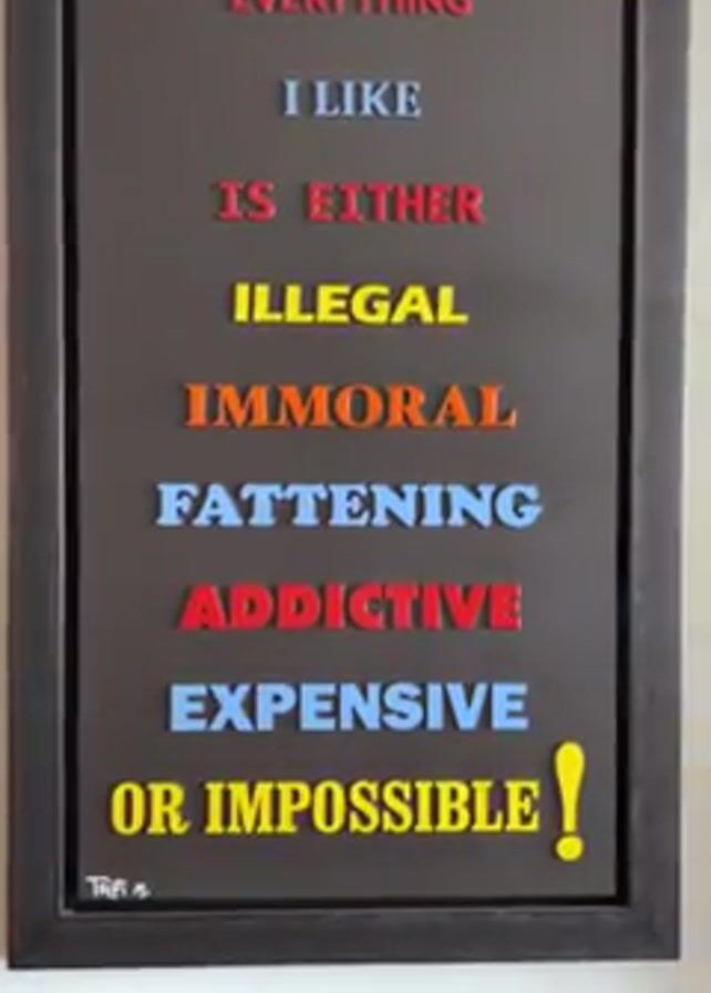 - "framed piece of art with the words "EVERYTHING I LIKE IS EITHER ILLEGAL IMMORAL FATTENING ADDICTIVE EXPENSIVE OR IMPOSSIBLE!" written on it" by FM-NKgjp2, licensed under CC BY 4.0