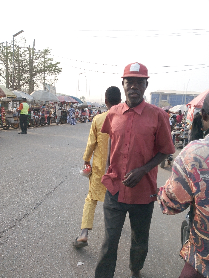 The image displays a busy street market scene on a paved road in Kagini, Nigeria, under a bright, hazy sky. A Black male, appearing middle-aged, stands prominently in the foreground, wearing a red short-sleeved collared shirt, dark trousers, and a red baseball cap with a white front emblem; he faces forward. To his immediate left, another Black male walks away, dressed in a yellow traditional tunic and trousers, holding a pair of white shoes with red accents. On the far right, the partial back and arm of a person wearing a multi-patterned shirt are visible alongside a motorcycle. The background is populated with numerous market stalls lining both sides of the asphalt road. These stalls utilize various covers, including colorful umbrellas (red, blue, white) and awnings, displaying assorted merchandise such as packaged goods and other market items. Multiple individuals are visible throughout the background, engaged in commerce or walking amongst the stalls. Infrastructure includes utility poles with numerous overhead wires, streetlights (some appearing solar-powered), and distant multi-story buildings, one featuring dark windows. Trees with sparse foliage are also visible in the left background. The scene is illuminated by diffused natural light, indicating daytime.