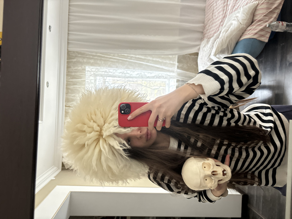 The image is a mirror selfie taken indoors, featuring a female individual. She is depicted from the upper torso upwards, with long dark hair, wearing a voluminous, cream-colored shaggy fur hat and a white sweater with horizontal black stripes. In her left hand, she holds a light-colored anatomical model of a human skull. Her right hand holds a red-cased smartphone, used to capture the image, partially obscuring her face. A silver ring is visible on her left ring finger, and a thin bracelet is on her left wrist. The reflected background reveals an interior space with light-colored walls, white crown molding, and two recessed ceiling lights. A window with light-colored sheer curtains shows outdoor tree branches. To the right, a partially visible bed with a red and white striped mattress cover, white bedding, a blue object, and a clear plastic bottle on a dark floor are present. The specific location within Slavyansk-na-Kubani, Russia, cannot be determined from the visual information provided.
