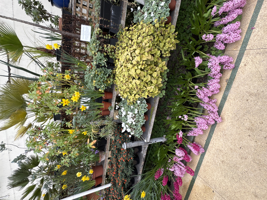 This image depicts a detailed plant display within the Belfast Botanic Gardens, specifically an indoor conservatory or greenhouse environment. The scene is dominated by multiple tiers of potted plants arranged on shelving units constructed from metal posts and wooden planks. In the upper background, tall green fan palms and other large foliage plants are visible in dark pots, some featuring taller plants with yellow flowers and reddish-orange tinged leaves. A brown wooden trellis section is present on the right side of the background. The upper-middle shelf tier prominently displays numerous potted yellow daffodils in terracotta-colored pots. Below this, another shelf holds various green foliage plants, including some with small red berries. A large cluster of plants with variegated, bright yellow-green leaves occupies the center of this tier, flanked by potted plants with white flowers and variegated green and white leaves, resembling cyclamen. The lowest shelf tier showcases a continuous row of plants with numerous small, bright red berries, followed by additional white-flowering cyclamen and more of the yellow-green variegated foliage plants. The foreground features a mottled pale yellow and beige paved floor. Along the base of the plant display, directly on this paving, are numerous bundles of cut or unpotted hyacinths with dense spikes of pink and magenta flowers. These are laid horizontally in a diagonal line extending from the lower left towards the mid-right of the frame. No individuals are present in the image.