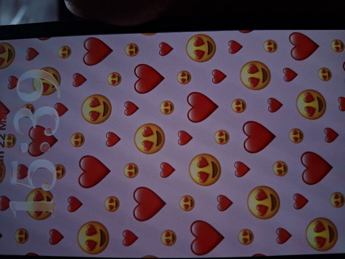 The image depicts a vertical close-up of a smartphone screen, situated within the city of Selyanin, Bulgaria. The specific point of origin within Selyanin is not discernible from the visual evidence. The screen displays its lock interface, featuring a repeating pattern wallpaper composed of numerous red heart emojis and yellow smiling face with heart-eyes emojis, varying in size, set against a light pink background. Overlaid digitally on this pattern, in a large, light-colored font, is the time '15:39'. Above the time, the characters '22 M' are partially visible, consistent with a date display. A dark, out-of-focus object, consistent with a human thumb, grips the right edge of the device. The immediate surrounding environment of the phone is dark and indistinct.