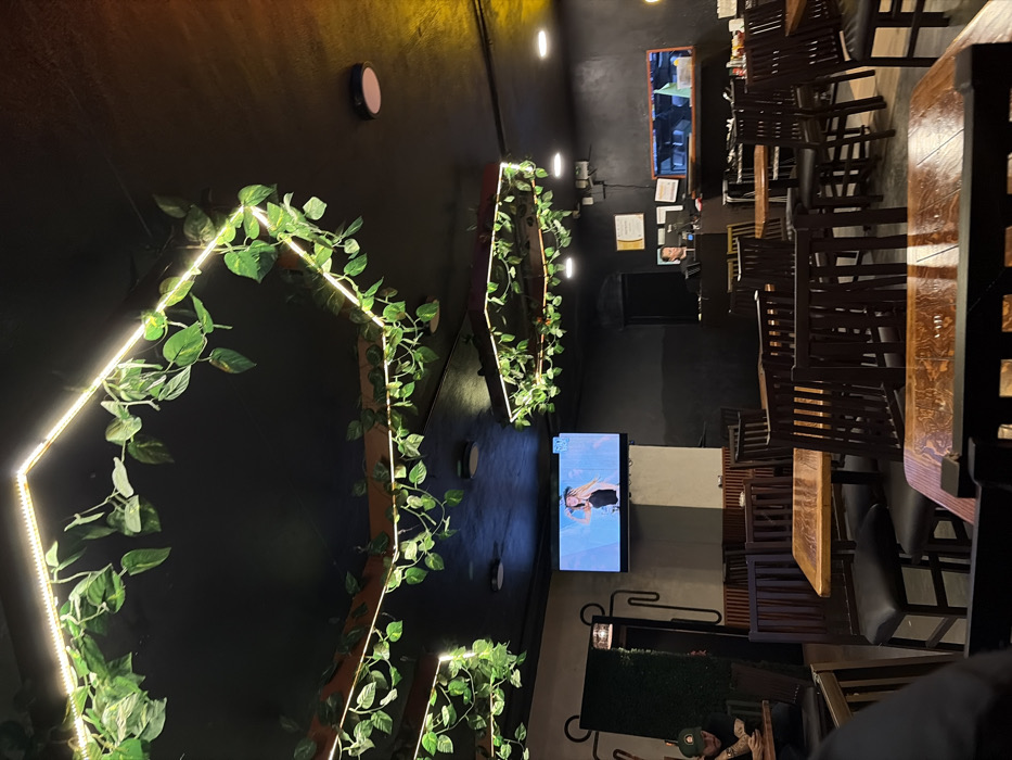 Dimly lit restaurant interior. Geometric light fixtures adorned with vines cascade down the black walls. Tables and chairs are visible, with a TV playing on a wall. The restaurant seems to be empty.