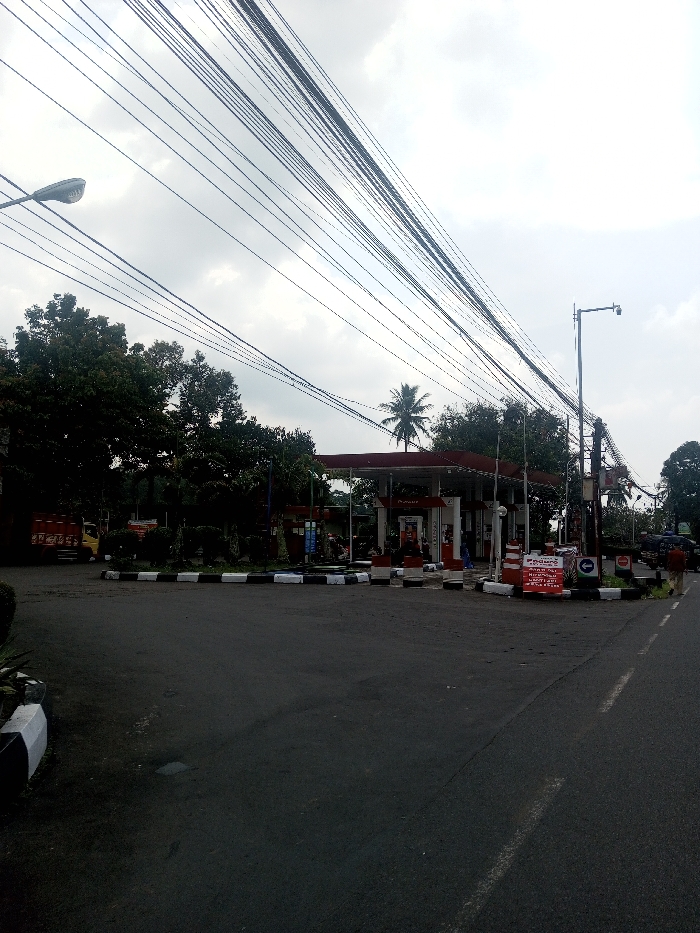 The image depicts an outdoor scene in the city of Niz Lakuk, India, featuring a gas station and its surrounding environment under an overcast sky. The foreground is dominated by a dark asphalt road with subtle lighter markings, leading towards the gas station. A small median with black and white curbing separates sections of the roadway. The gas station, situated on the right-center, consists of a structure with a prominent red canopy supported by white pillars. Multiple fuel pumps are visible beneath the canopy, some displaying "Pertamina" branding. Several indistinct individuals are present near these pumps, appearing to be engaged in transactions or vehicle servicing. To the left of the gas station, a cluster of dense green trees is visible, partially obscuring the background. A light-colored truck is parked among these trees on the far left. A tall, slender palm tree is situated directly behind the gas station canopy, towering over other foliage. On the right side of the image, an individual wearing a dark shirt and light trousers walks away from the viewer on the edge of the road. A tall metal street lamp post with an attached security camera (CCTV) stands prominently on the right, next to various utility poles heavily strung with numerous overhead electrical or communication wires that traverse the upper half of the image. Another street lamp is visible on the far left, also accompanied by numerous overhead wires. Multiple signs are present near the gas station entrance, including a red and white promotional sign and other directional or regulatory signs, one indicating a left turn and another appearing to be a "STOP" sign. The overall environment suggests a bustling, functional area.